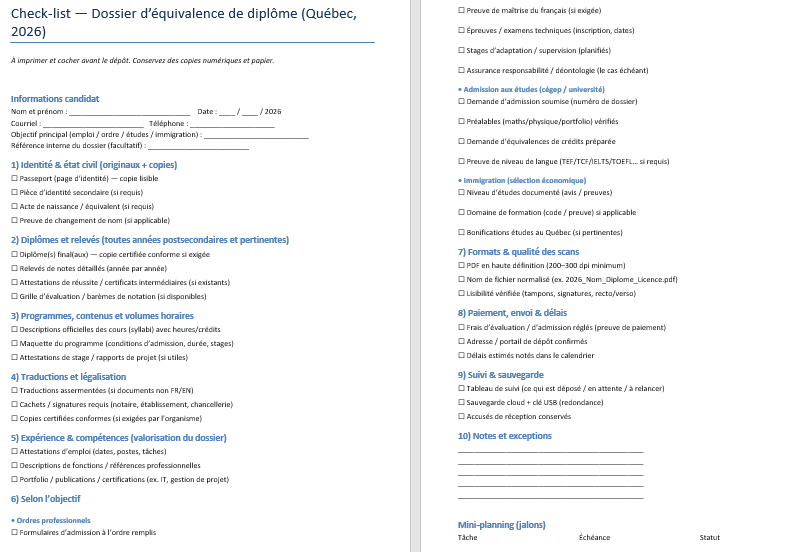 - En 2026, l’“équivalence de diplôme” au Québec est multi-piste : niveau scolaire, points (sélection), accès aux études, permits d’exercice.