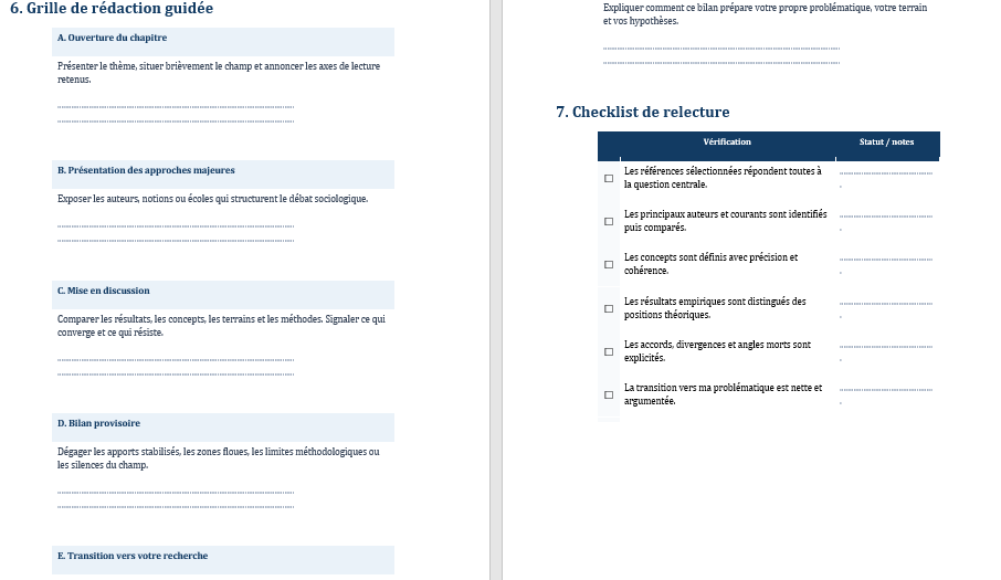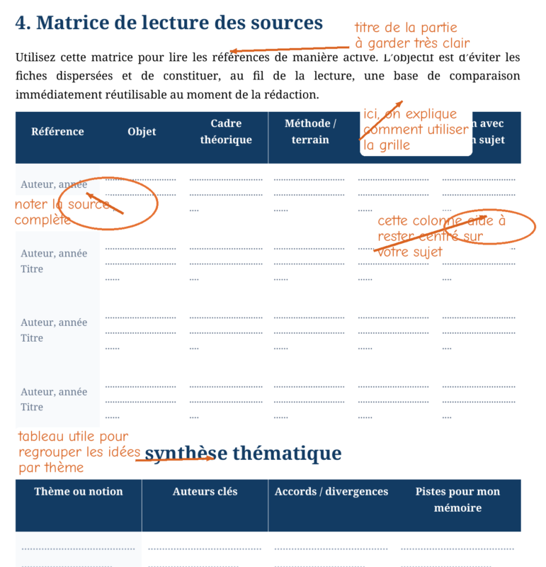 Beaucoup d’étudiants gagnent aussi à construire un tableau de lecture. Ce type d’outil aide à garder une vue d’ensemble sur les sources, à repérer les convergences, à éviter les répétitions et à préparer plus facilement la rédaction. L’écriture devient alors moins lourde, parce que la matière a déjà été organisée en amont.