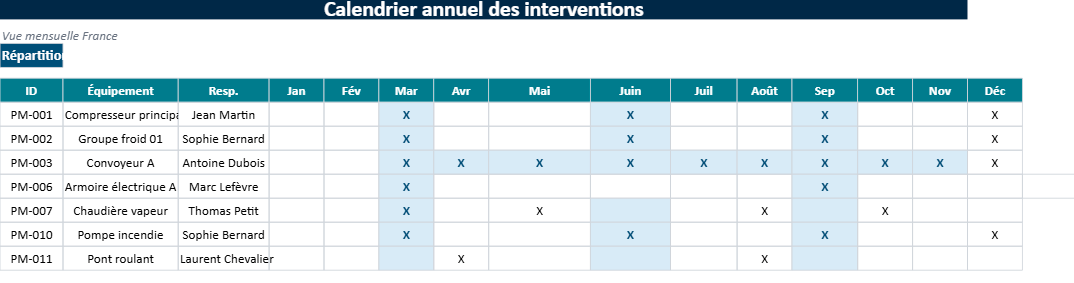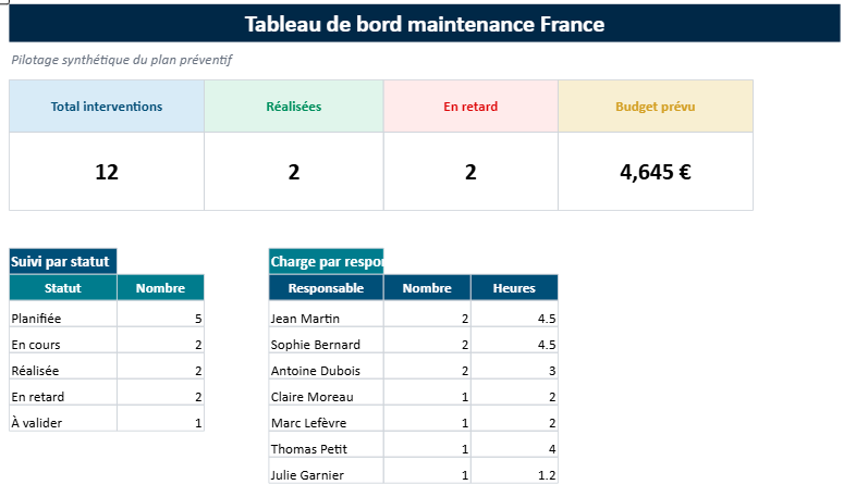 Le fichier peut aussi servir de support de réunion. Lors d’un point hebdomadaire ou mensuel, le responsable maintenance dispose enfin d’un document lisible pour discuter des retards, des priorités et des charges à venir.