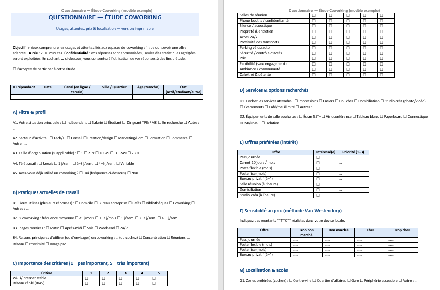 - A — Filtre & profil : statut (indépendant, salarié, étudiant…), secteur, taille d’orga, cadence télétravail, usage antérieur du coworking.