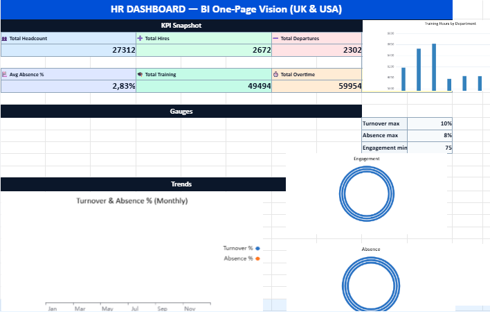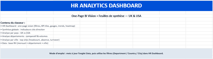 This Excel workbook has been designed as a compact HR analytics toolkit that combines a one-page dashboard with several analytical sheets. The goal is simple: give managers and HR teams a clear, visual understanding of workforce trends across UK and US locations without requiring complex BI software.