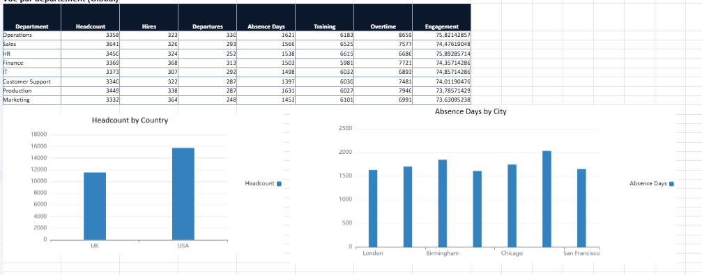 Shows workforce metrics by department, helping identify areas with heavier workload, higher training investment, or stronger engagement.