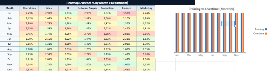 - Absence heatmap highlighting departments and periods with higher absence rates