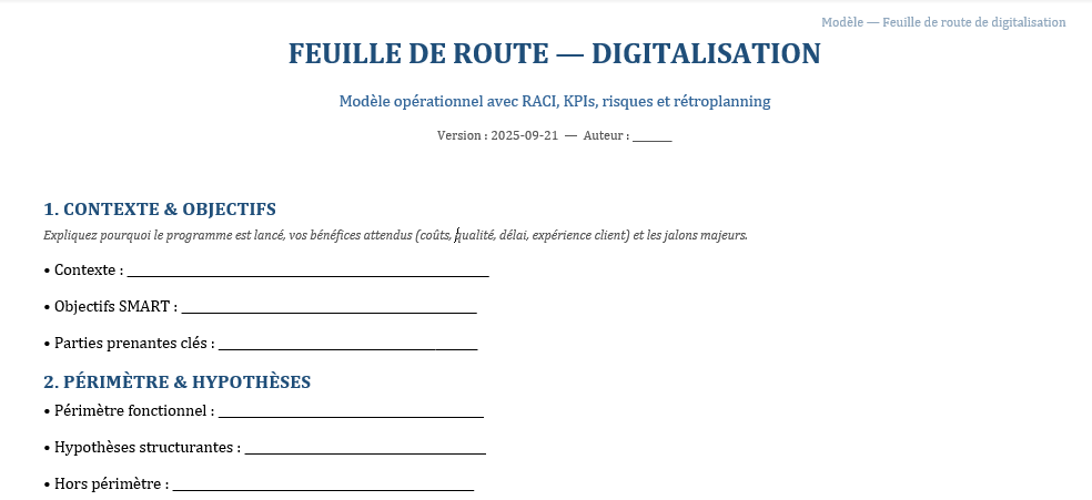 La feuille de route de Digitalisation d’entreprise organise votre programme de transformation digitale. Ci-après un guide opérationnel pour utiliser le modèle Excel :