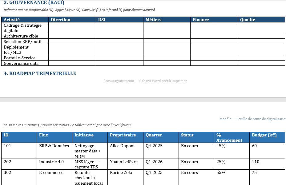 - Contenu : ~15 initiatives d’exemple multi-pôles (ERP & Données, Industrie 4.0, Data/BI, E-commerce/CX, Finance, IT Ops, Cybersécurité, RH/Change, Supply, Conformité).