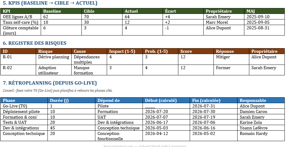 - Tenez à jour Risques et KPIs à un rythme mensuel (ou hebdo pour un projet critique).