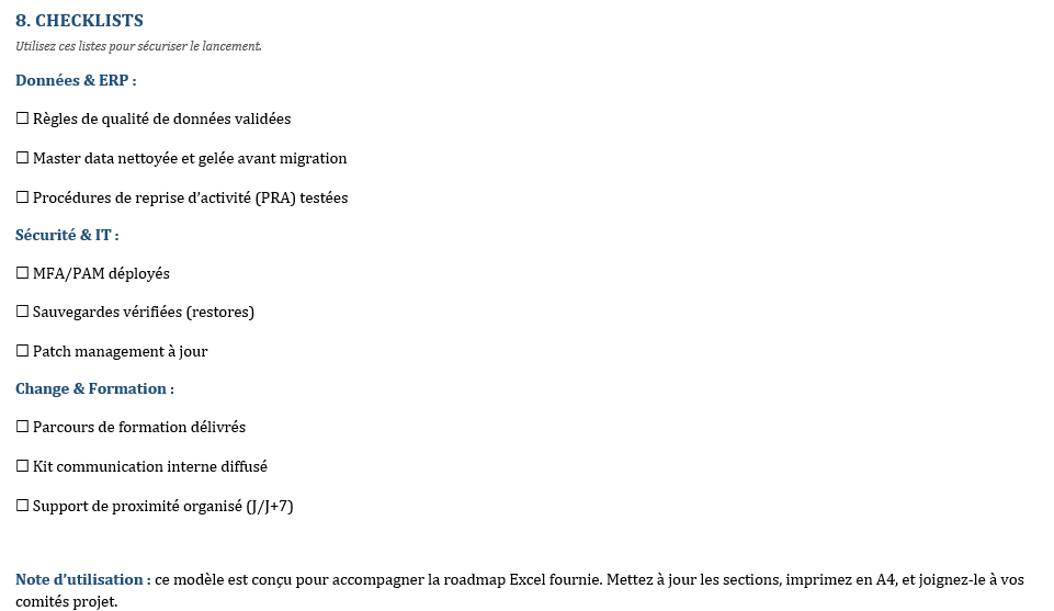 - Tableau : Tâche × rôles (Direction, DSI, Métiers, Finance, Qualité).