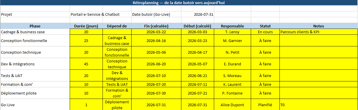 - Formules : le Go-Live fixe la Fin ; chaque phase au-dessus calcule Fin = Début de la phase suivante − 1 jour et Début = Fin − (Durée − 1).