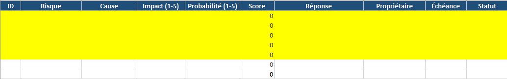 - Colonnes : ID, Risque, Cause, Impact (1-5), Probabilité (1-5), Score (= Impact × Prob.), Réponse, Propriétaire, Échéance, Statut.