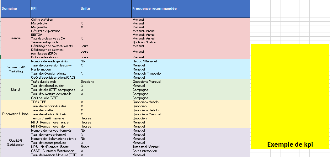 • une feuille “Pépinière_KPI” recense les fiches synthétiques (nom, formule, périmètre, seuils)