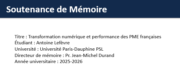 Le diaporama repose sur un mémoire fictif mais crédible, présenté comme s’il avait été soutenu à l’Université Paris-Dauphine PSL par Antoine Lefèvre, sous la direction du Professeur Jean-Michel Durand. Ce choix donne à l’ensemble une tonalité réaliste et académique, tout en permettant de proposer un modèle directement exploitable pour d’autres sujets de mémoire ou de recherche.
