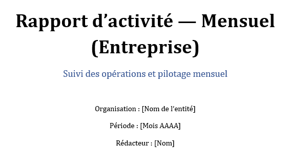 - Entreprise — Rapport mensuel : pilotage global, suivi d’objectifs, écarts, arbitrages.