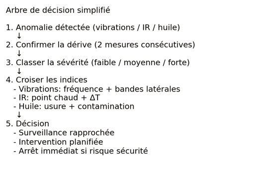 - Proposer une décision maintenance en trois niveaux (surveillance, intervention planifiée, arrêt).