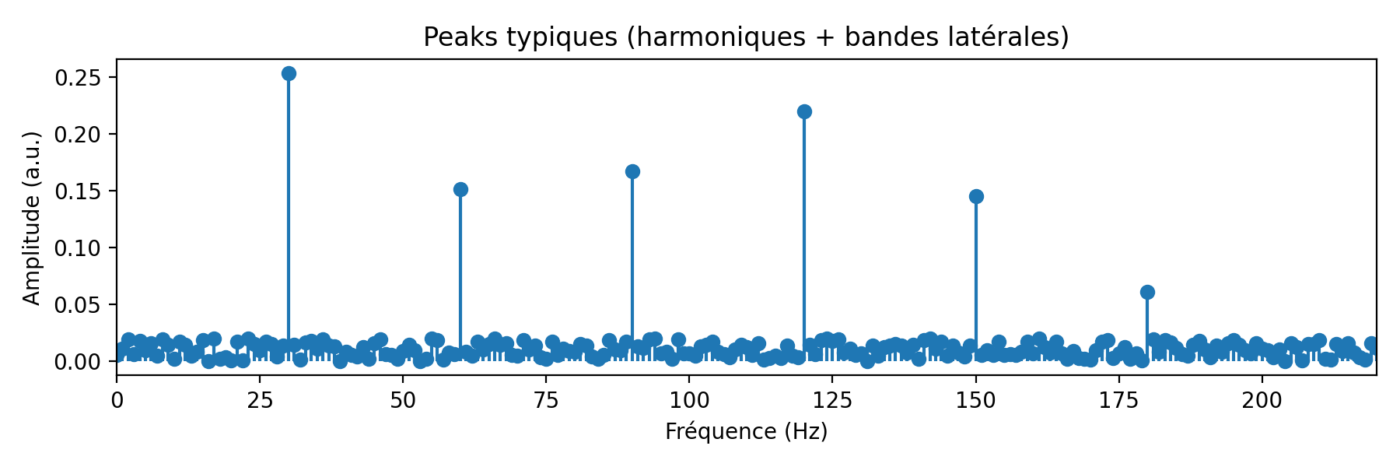 - Les pics à 30, 60, 90 Hz sont des harmoniques de rotation 1×,2×,3×fr.