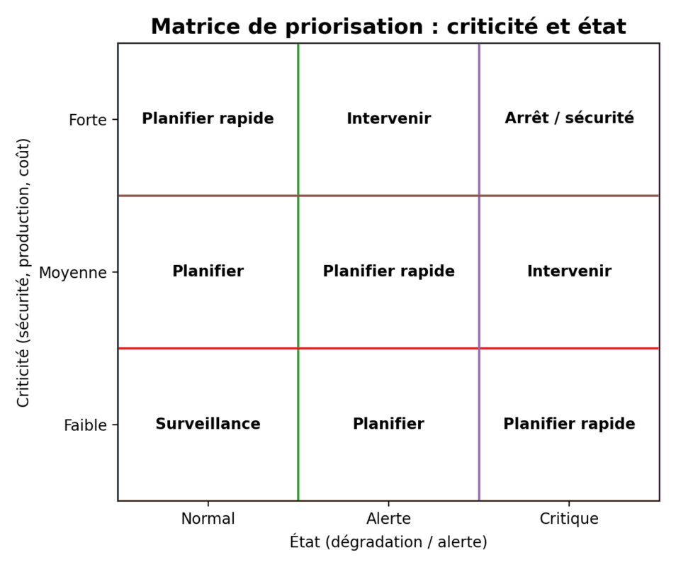 1. Règle : utiliser une matrice criticité (sécurité/production/coût) et état (normal/alerte/critique). Le Schéma 4 donne une lecture opérationnelle : surveillance, planifier, intervenir, arrêt sécurité.