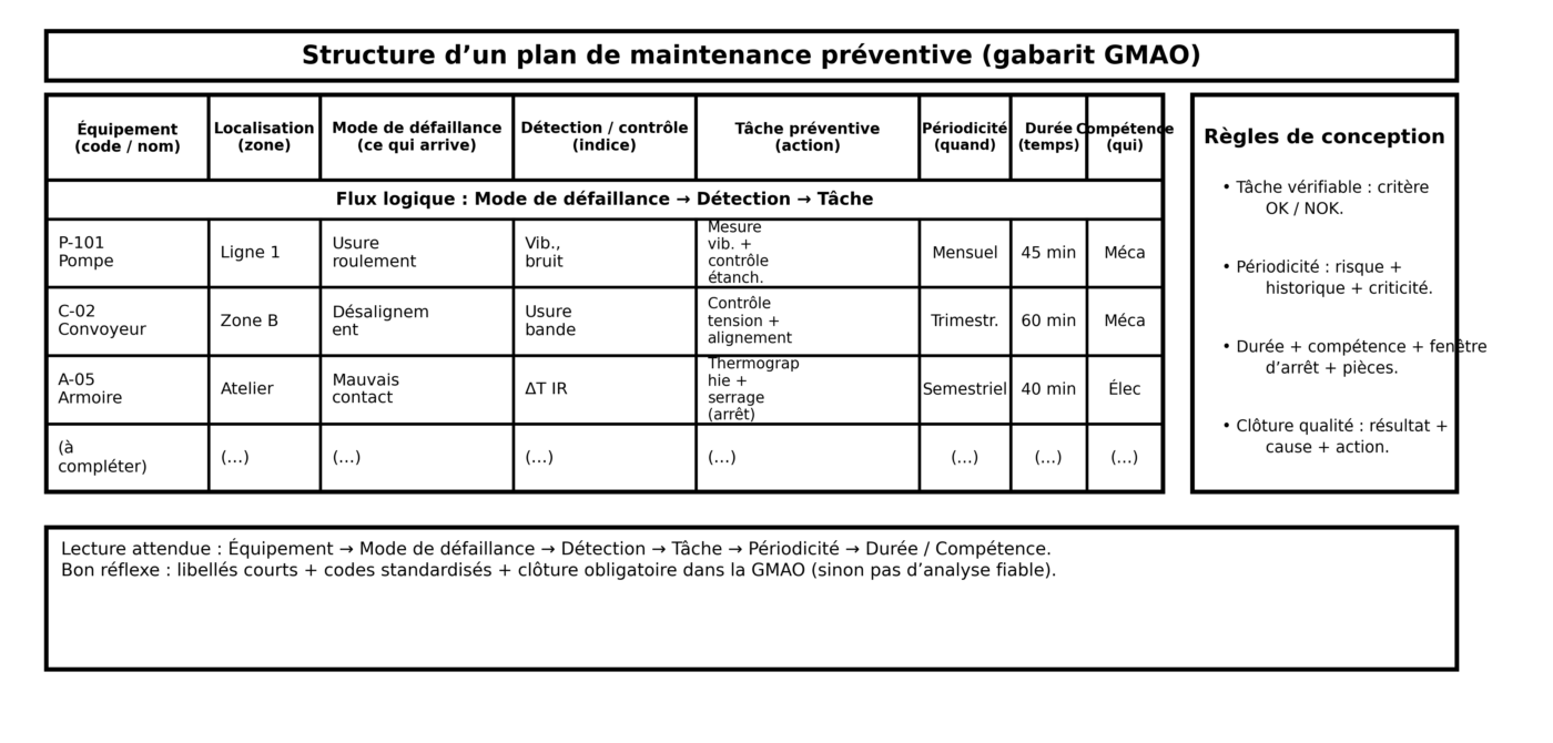 • Plan préventif clair et mesurable (tâches, périodicités, durées, compétences).