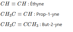 Les alcynes possèdent une triple liaison carbone-carbone et sont nommés avec le suffixe « -yne ». La position de la triple liaison est précisée si nécessaire.