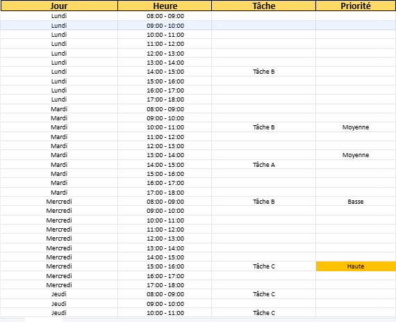 | Lundi | 08:00 – 09:00 | Tâche A / B / C | Haute / Moyenne / Basse |