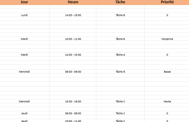 | Lundi | 08:00 – 09:00 | Tâche A | Haute |