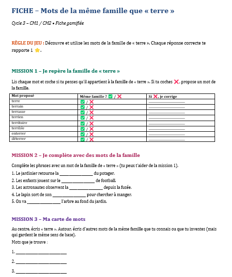 La fiche gamifiée autour de « terre » transforme cette exploration en parcours guidé : missions à remplir, cases à cocher, phrases à compléter, carte de mots à construire. L’élève ne se contente pas de répondre à des questions, il progresse dans un petit scénario où chaque réussite rapporte des ⭐ et renforce sa compréhension. Le tri vrai/faux sur les mots proposés installe un regard critique sur les ressemblances trompeuses (terrible n’est pas de la famille de terre), les phrases à trous obligent à choisir le bon mot dans le bon contexte, la carte mentale finale donne une vue d’ensemble facile à mémoriser. Le résultat : un travail sérieux sur le vocabulaire, l’orthographe et le sens… sans perdre le plaisir de jouer avec les mots.