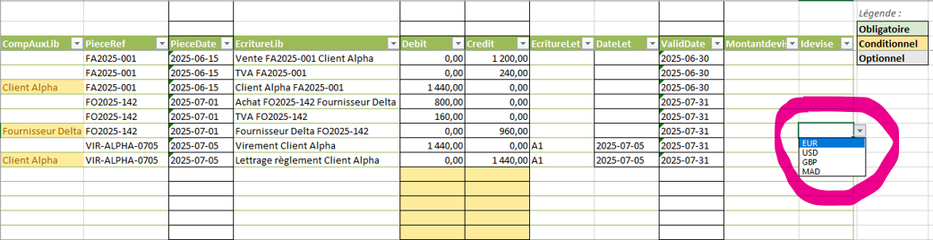 - Lettrage / ValidDate / Devise : utiles, quand disponibles.