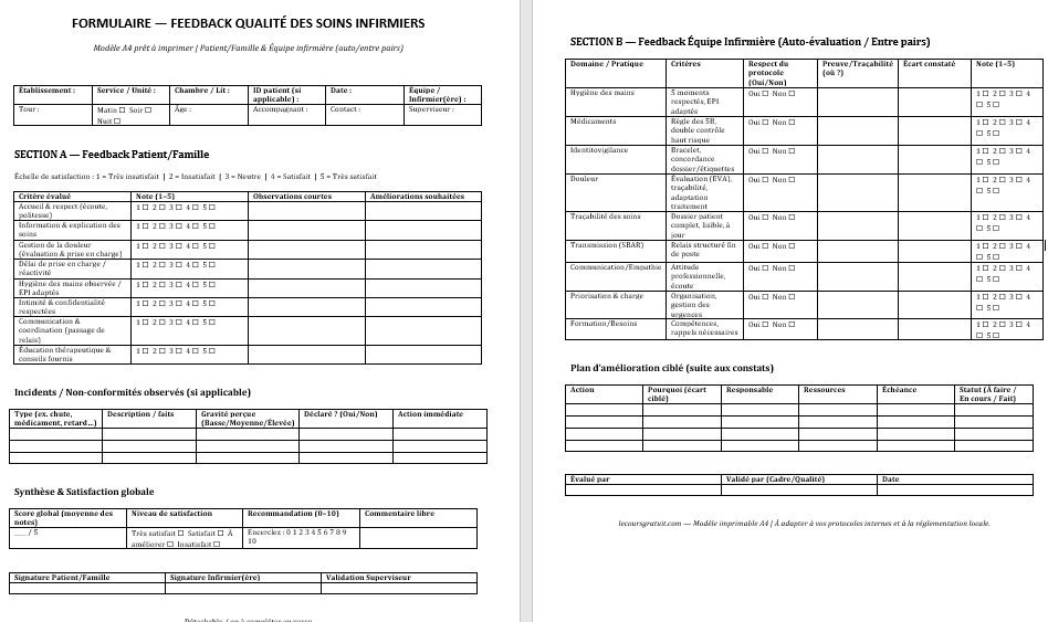 - Auto-évaluation infirmière (checklist Oui/Non + note 1–5).