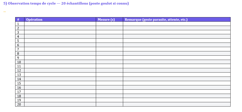 - Mesures de cycle (×20) sur le poste goulot ou critique.