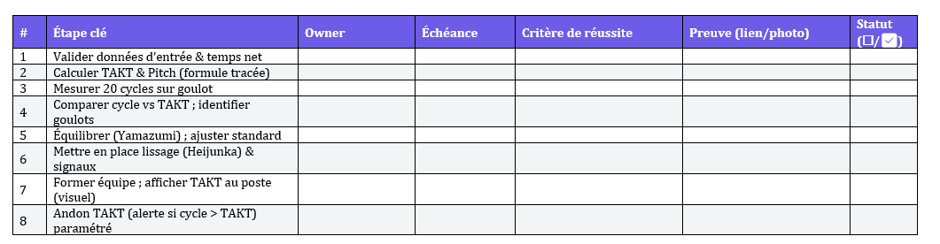 Le takt time est la cadence client traduite en rythme de travail soutenable pour l’atelier. La feuille de mise en œuvre sert de rail opérationnel : elle cadre les données d’entrée, calcule le takt, compare au réel, oriente l’équilibrage (Yamazumi), installe le lissage (Heijunka), et verrouille la tenue par des preuves et des standards à jour.