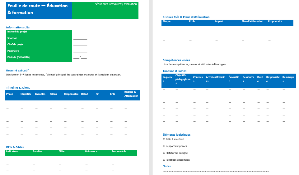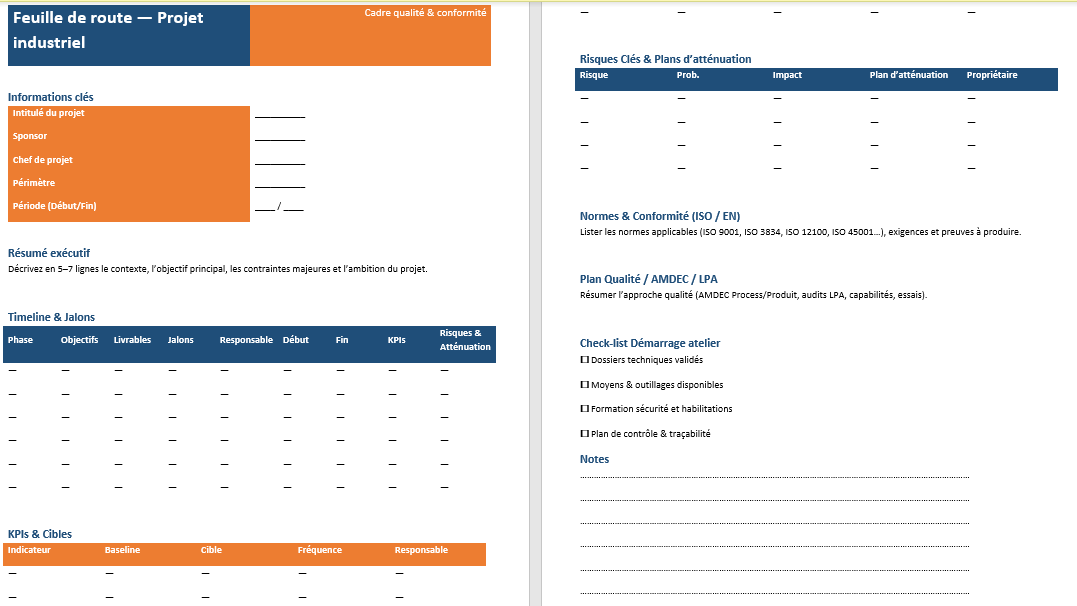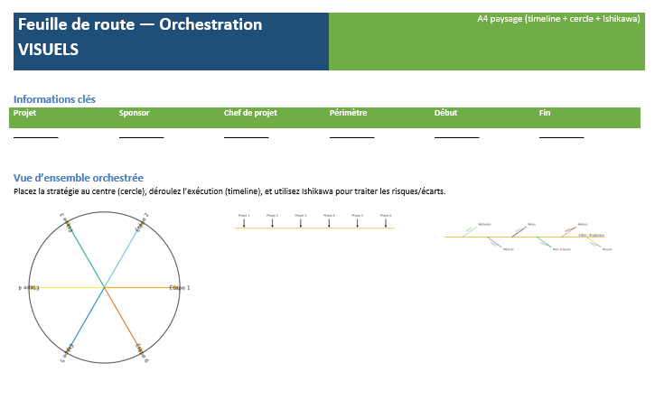 Vous pouvez partir de modèles Word structurés (bandeau, “Informations clés”, Timeline & jalons, KPIs, Risques, RACI, Notes) et de leurs variantes visuelles (timeline fléchée, swimlanes, circulaire, RAG, heatmap, Ishikawa).