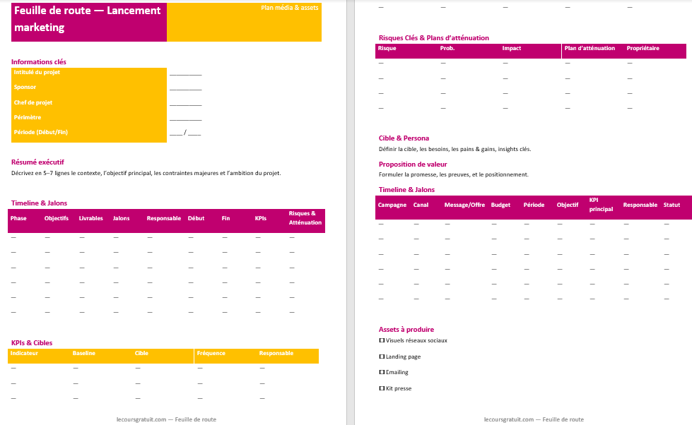 - Jalons : kit créa, landing, campagnes, partenariats.