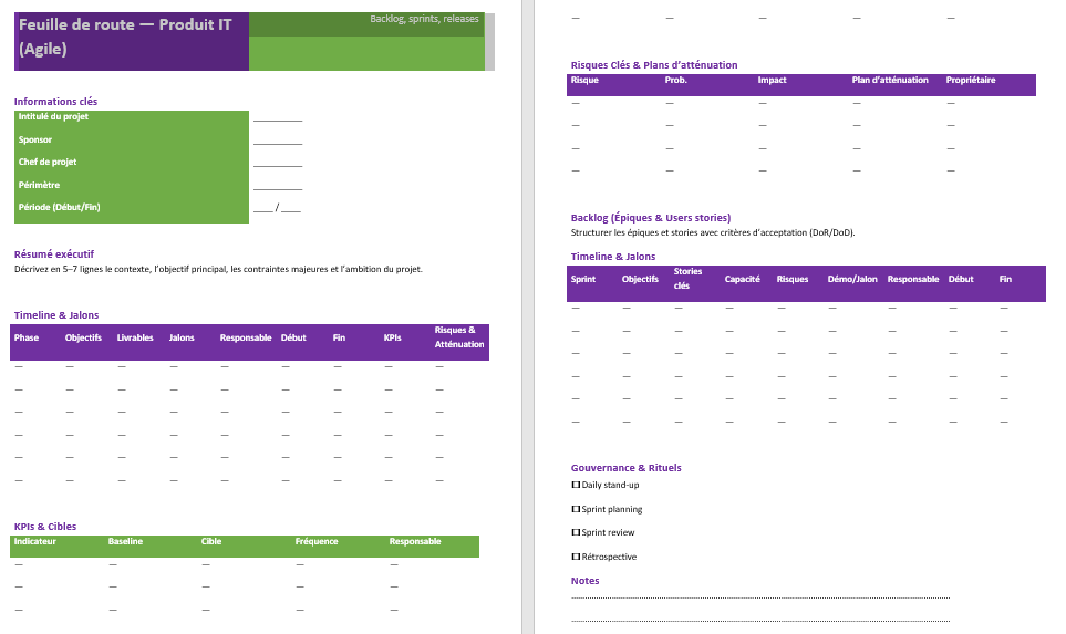 - Roadmap : vision temporelle macro (trimestres/mois), orientée objectifs & livrables.