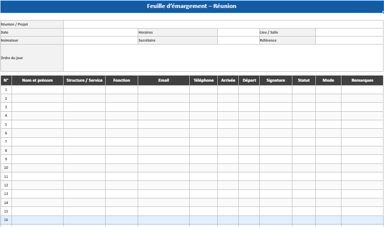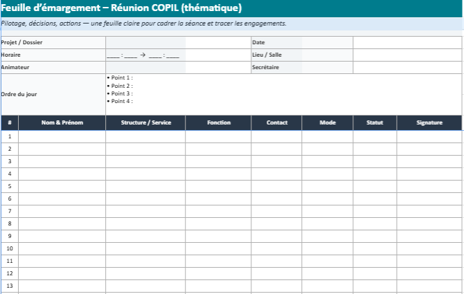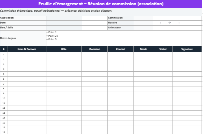 La seconde utilité est moins visible mais encore plus utile : structurer le déroulé. Une feuille d’émargement qui inclut un en-tête complet et un espace “ordre du jour” force naturellement la réunion à se poser. On ne démarre plus “à l’arrache” : on sait ce qui est traité, et on sait dans quel cadre la réunion s’inscrit (projet, commission, conseil, assemblée, etc.).