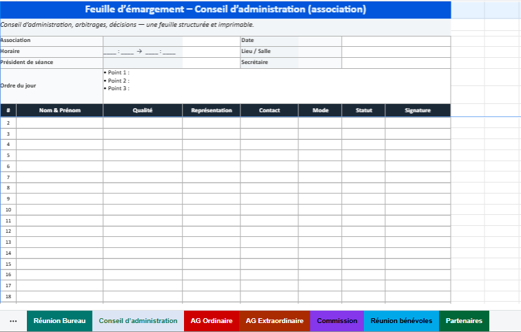 Pack Excel Association – Feuilles d’émargement multi-réunions imprimables et prêtes à l’emploi
