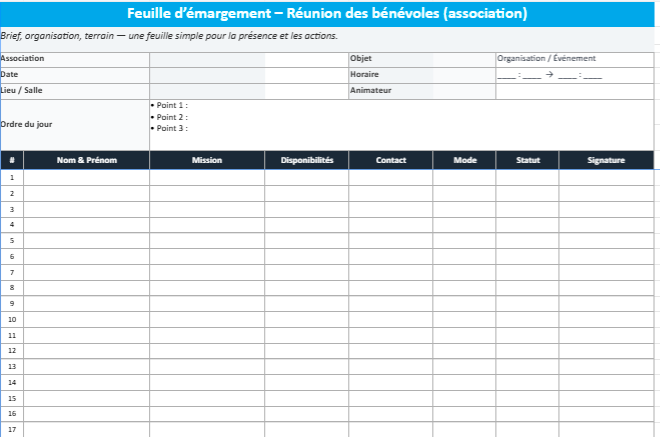 Dans les contextes associatifs comme dans les environnements professionnels, une feuille de présence bien conçue devient un support d’organisation. Elle donne immédiatement le cadre : qui était là, à quel titre, sur quel ordre du jour, avec quels engagements à la sortie. En somme, elle sécurise la réunion… et elle simplifie la suite.