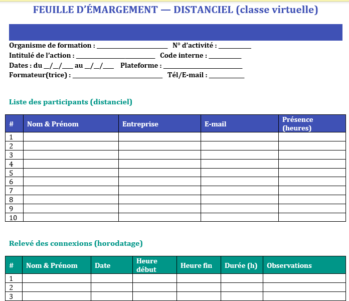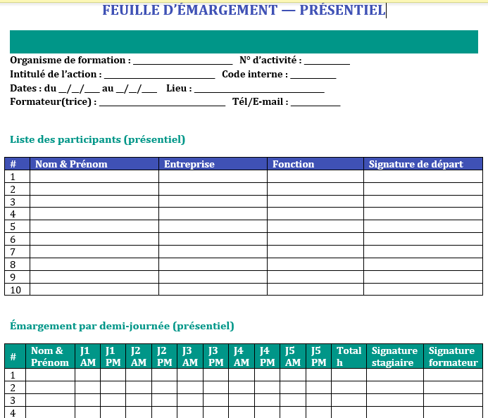 Feuille d’émargement — Modèle Word conforme (présentiel & distanciel)