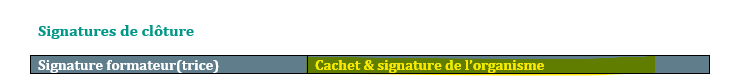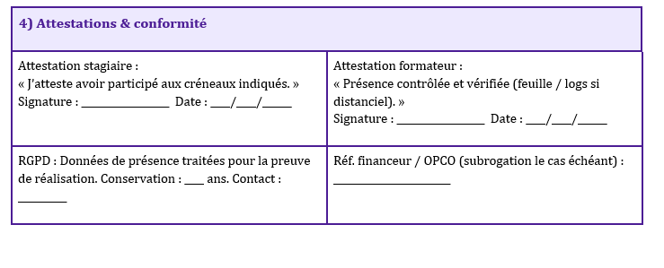 - Ligne formateur : signature formateur en bas de page, attestation du bon déroulement.