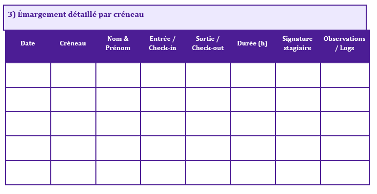 - Colonnes : Nom & Prénom, Entrée matin, Sortie matin, Entrée après-midi, Sortie après-midi, Durée réalisée (h), Signature stagiaire, Observations.