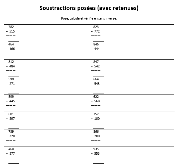 - Soustractions posées (avec retenues) — Technique posée + contrôle par addition inverse.