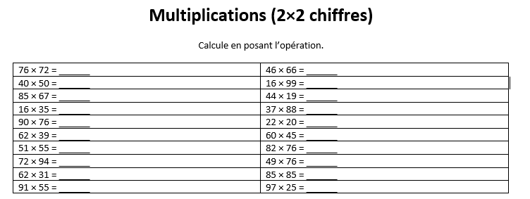 - Estimation d’abord. Avant une multiplication 2×2, estimer : 70×30 ≈ 2100. Le résultat posé doit rester « dans la fourchette ».
