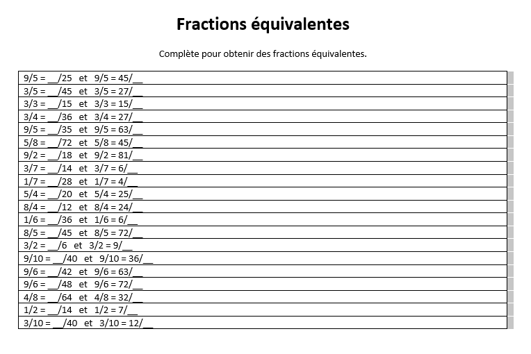 - Fractions équivalentes — Compléter numérateur/dénominateur, comprendre l’amplification.