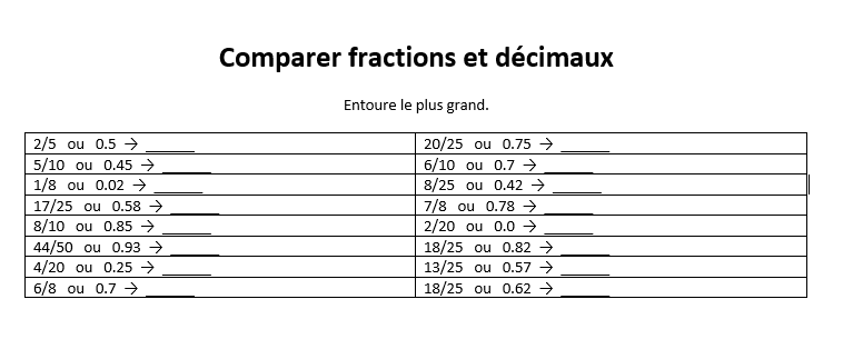 - Comparer fractions & décimaux — Passer d’une écriture à l’autre, entourer le plus grand.