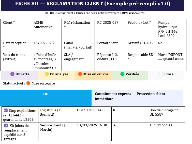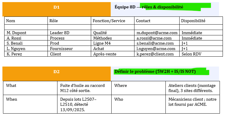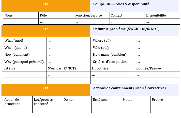 • Équipe 8D nommée (Qualité, Méthodes/Process, Production, Achats/Fournisseur, Après-vente).