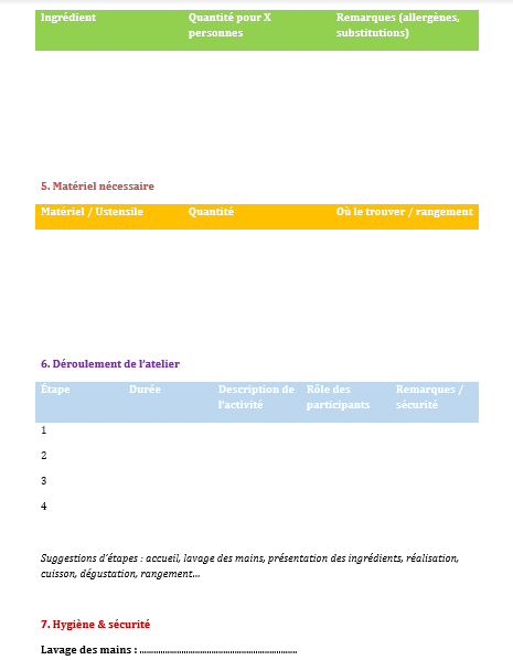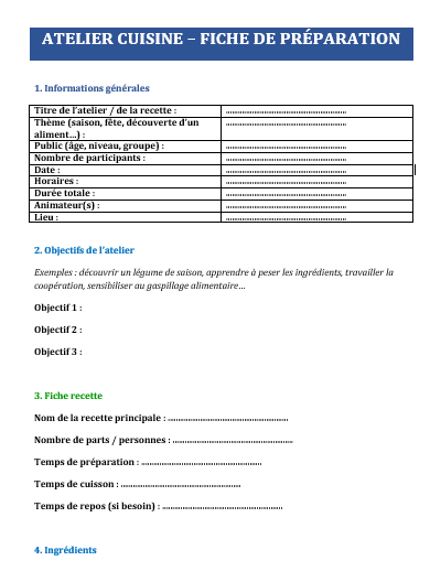 Rassemblées sur une seule page, ces informations transforment l’atelier cuisine en véritable rendez-vous, préparé et assumé. La fiche devient alors un point de repère pour les collègues, les responsables et, à terme, pour toute personne souhaitant reprendre ou reproduire l’atelier dans le même esprit.