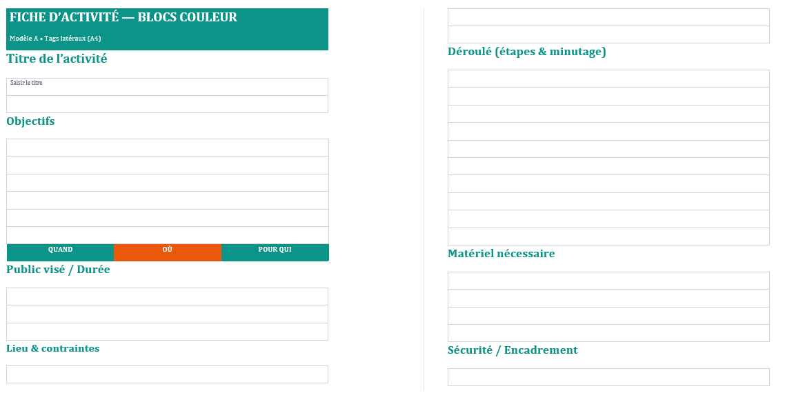 Le haut de page présente un titre court et concret. La ligne suivante installe le contexte utile : pour quel public, quel lieu, quelle durée. Viennent ensuite les objectifs, rédigés de manière mesurable pour qu’ils puissent être évalués. Le cœur de la fiche détaille le déroulé de l’activité en étapes faciles à suivre, avec des horaires ou une séquence logique. Une zone matériel évite les allers-retours et une zone sécurité rappelle les consignes, les responsabilités et, si nécessaire, les mentions RGPD. La partie évaluation ferme la boucle avec les indicateurs à relever et la trace à conserver, afin que la réunion suivante ne reparte pas de zéro.