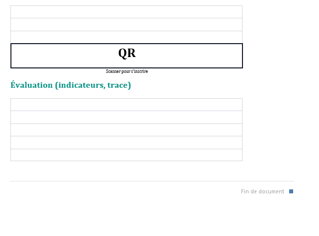 Bandeau haut couleur, ligne de tags “QUAND / OÙ / POUR QUI” en cellules colorées, blocs à lignes éditables (tables 1-colonne) pour Titre, Objectifs, Déroulé, etc. Cadre QR (table bordée) à remplacer par votre image QR. Marges confort (≈ 1,8 cm) et mise en page stable à l’impression.