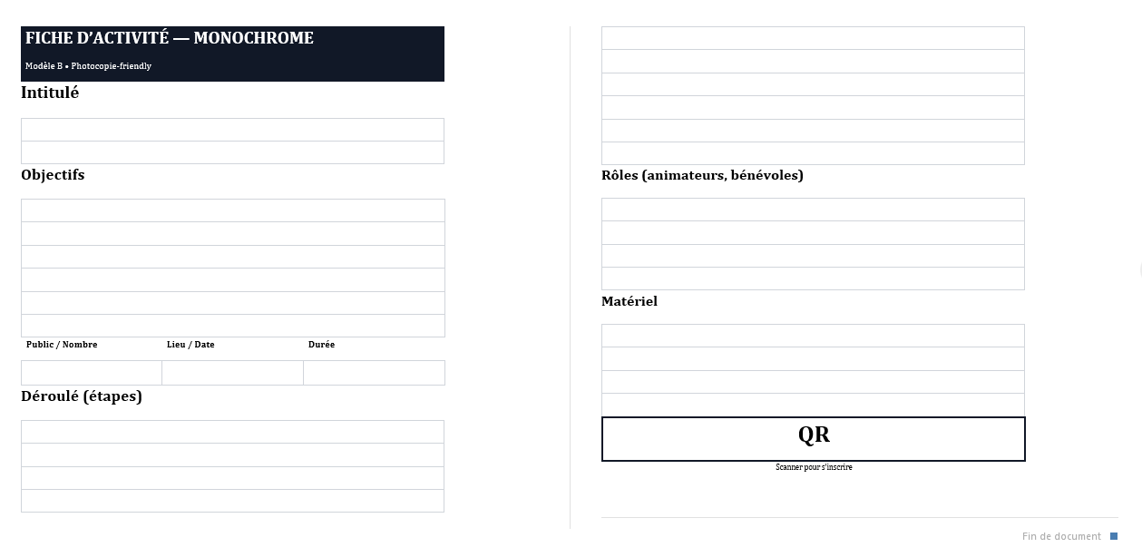 Pour que l’action avance sans se perdre, il faut un support simple, stable et visible. La fiche d’activité joue ce rôle en deux formats complémentaires : Word, vivant et éditable pour cadrer la préparation, distribuer les rôles et arrêter les décisions en réunion ; PNG, clair et robuste pour l’affichage mural, la mise à jour au feutre et le lien direct via QR. Même contenu, même structure, deux usages qui se répondent : la version source aligne les équipes, la version affichée rend le projet lisible au quotidien. Ensemble, elles transforment une intention en trajectoire partagée et vérifiable.