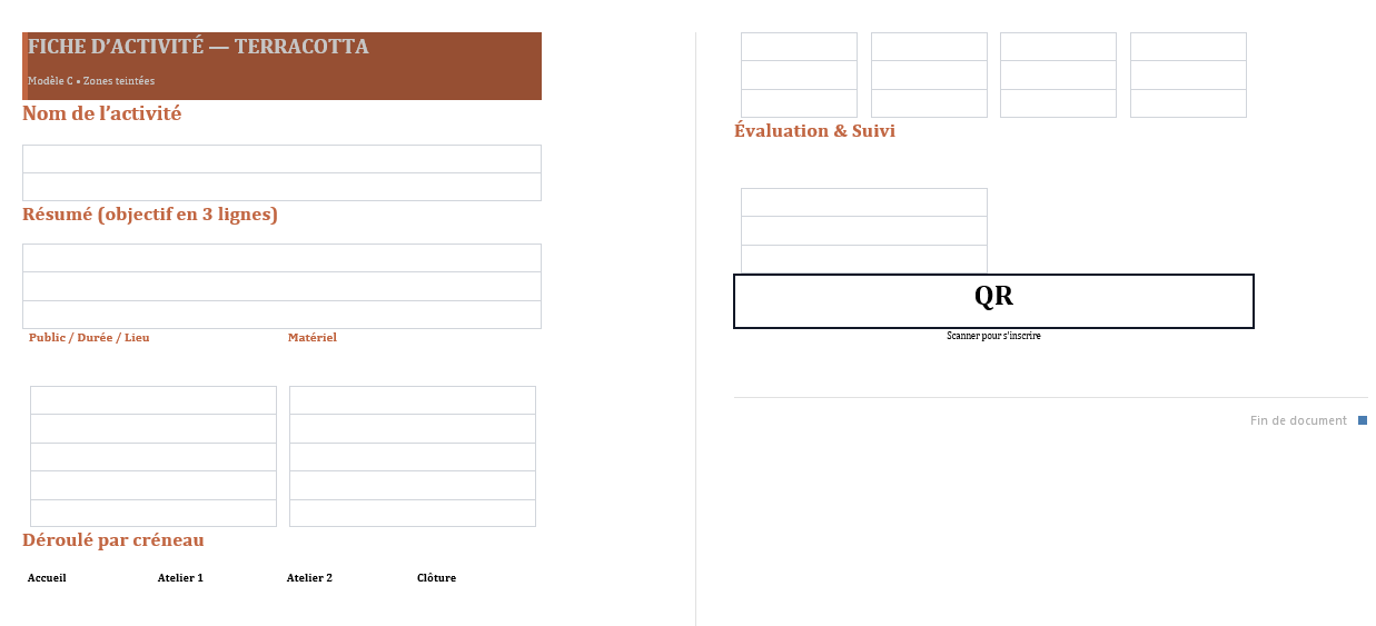 Bandeau terracotta, Résumé en encadré, double colonne Public/Durée/Lieu & Matériel. Timeline 4 cartouches (table 2×4 avec sous-Tableaux) prête à détailler vos étapes. Évaluation & Suivi en encadré, QR inclus.