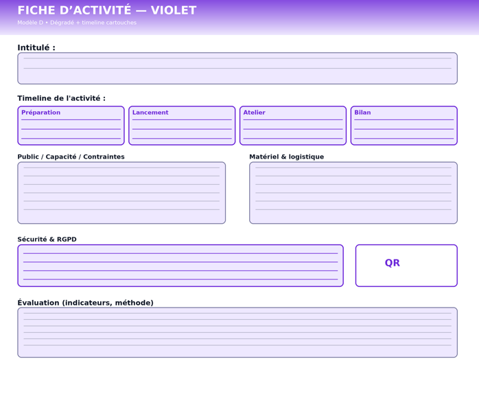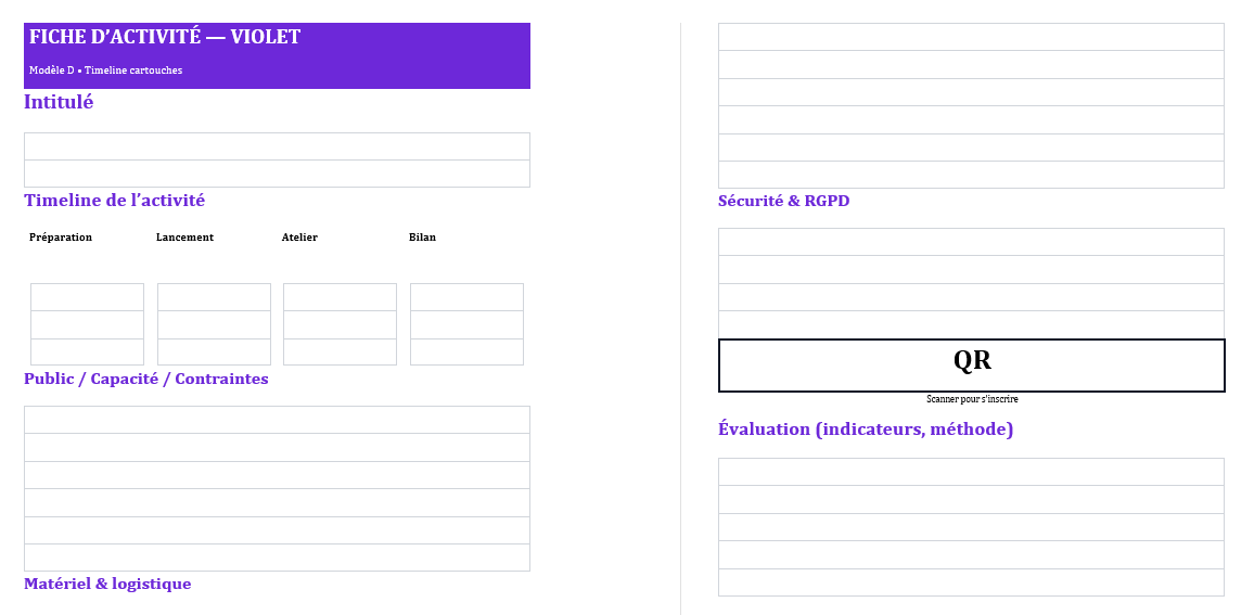 Bandeau violet, Timeline 4 cartouches, blocs à lignes pour Public/Capacité/Contraintes, Matériel & logistique, Sécurité & RGPD, Évaluation. Structure idéale pour ordres du jour et comptes rendus rapides.
