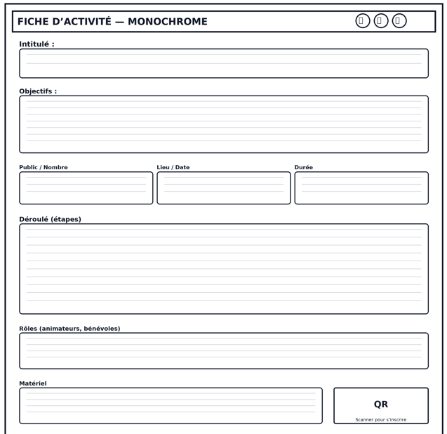 Bordures noires épaisses, pictos cerclés ⏱ / 📍 / 👥 en tête, mise en page très lisible en noir & blanc. Trois colonnes “Public/Nombre – Lieu/Date – Durée”, blocs à lignes pour Objectifs, Déroulé, Rôles, Matériel, et un cadre QR. Parfait pour tirages massifs et panneaux temporaires.