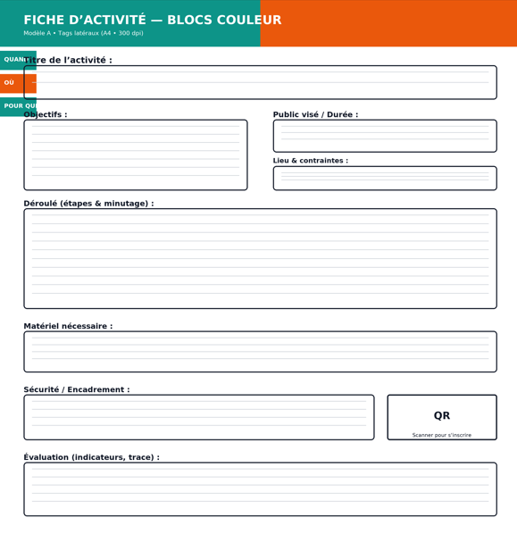 En-tête bicolore très visible, trois tags latéraux “QUAND / OÙ / POUR QUI” qui attirent l’œil, grands blocs à lignes pour Titre, Objectifs, Déroulé (étapes & minutage), Matériel, Sécurité/Encadrement, Évaluation. Cadre QR en bas à droite. Idéal pour un affichage dynamique dans un hall ou un atelier.